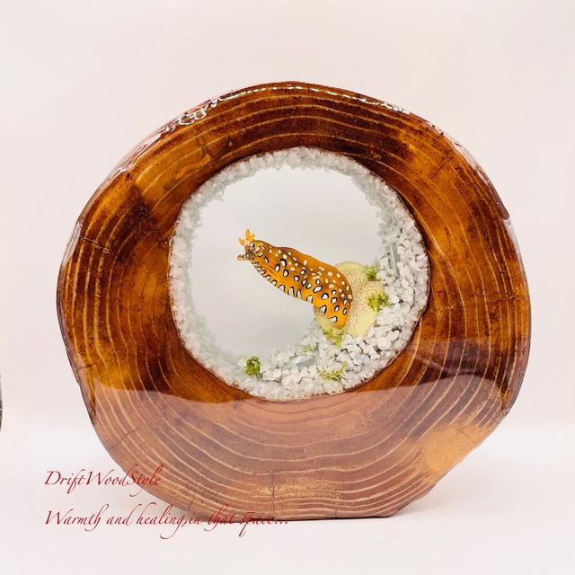 流木で海の世界を表現したレジンアートになります。 〇作品について 太い天然流木を切り抜き,そこに水中アクアリウムを再現しました。 流木と海の世界を結び付けて表現するために作成した,レジンアートです。 トラウツボのオブジェになります。 存在感のある作品ですのでインテリアとして楽しめます。 夜光石を使用していますので、闇で優しく光ります。 ○設置方法 お好きなところに飾って楽しめます。 レジンで硬化していますが,デリケートな作品なので表面に傷がつかない様に取り扱いにご注意ください。 〇流木と加工について 日本海から流れ着いた流木を一つ一つ採取選別し,処理,洗浄,乾燥などを経て,世界に一つだけの流木インテリアを制作しています。 採取・洗浄した流木を切り抜き,レジンで加工しています。 〇サイズ 横幅14cm,高さ13cm,奥行4cm 〇配送について 梱包してレターパックプラスにて配送致します。 天然流木を使用していますので,流木にあるキズ,汚れ,虫食い,ささくれ跡などがあります。 それらの凹凸などを含めて流木の魅力になりますので,ご理解頂ける方にご購入をお願いいたします。 撮影環境やライトの色合いで,実物と写真の色合いが若干異なる場合がございます。 また,画像には移しきれない部分がある場合もありますのでご了承ください。 ※ 他のサイトでも販売している関係で売り切れになる事もございます。 その際はキャンセルさせていただきますが、ご了承いただきますようお願いいたします。