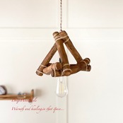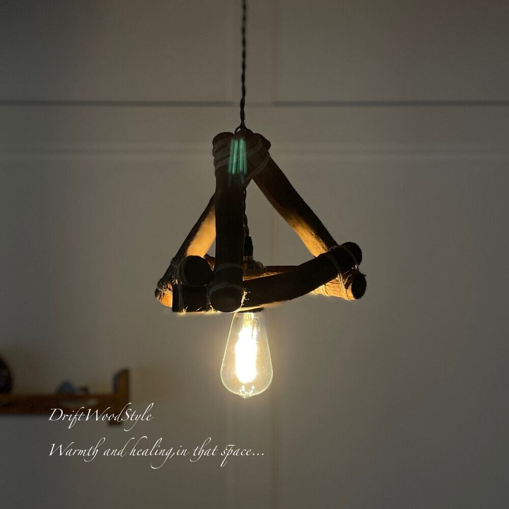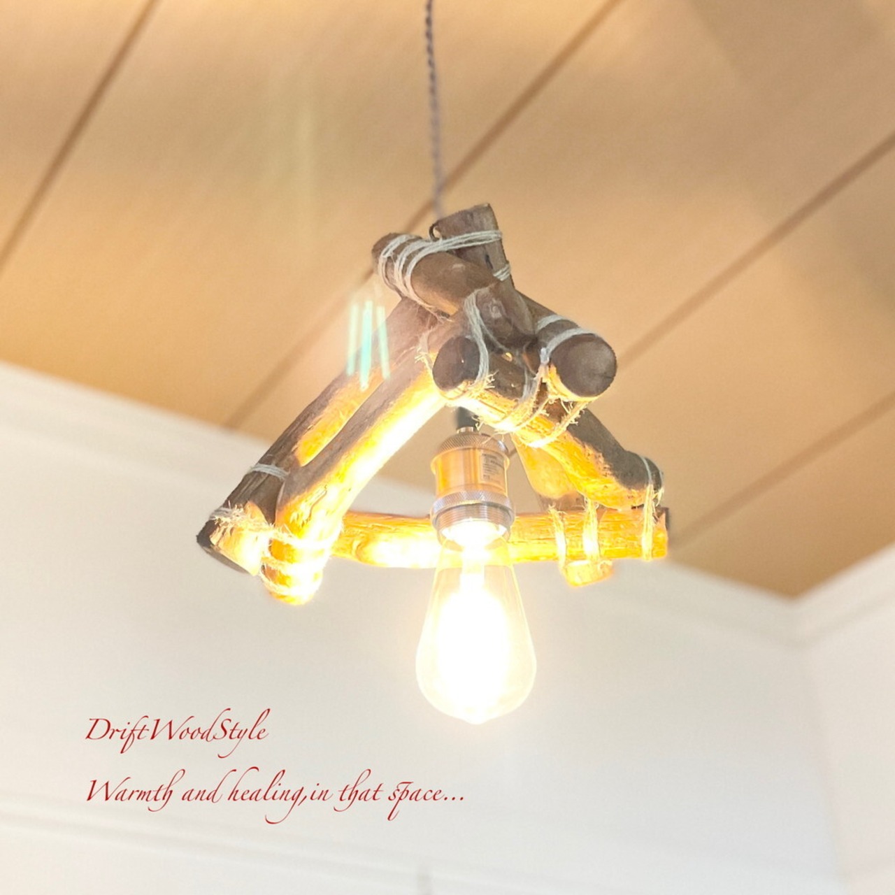 流木を麻ひもで組み合わせたシェードと,ペンダントライトのセットとなる作品です。