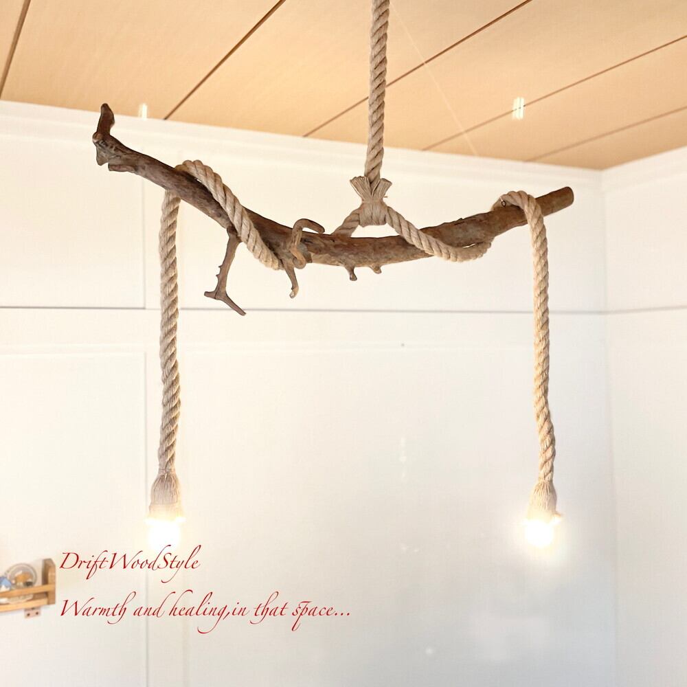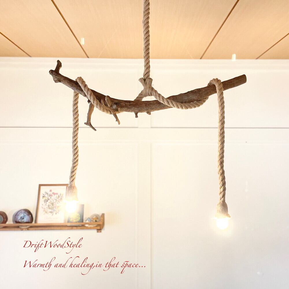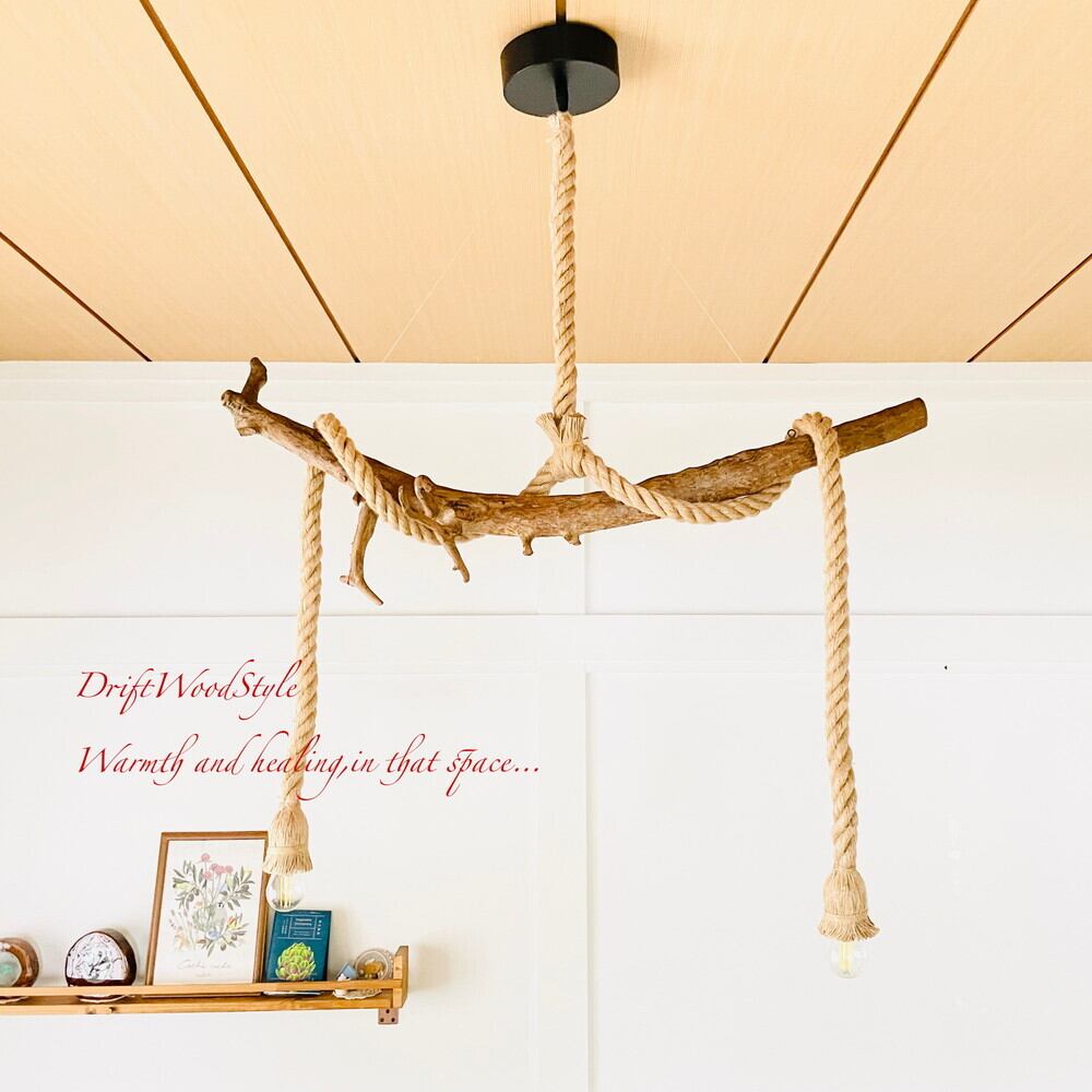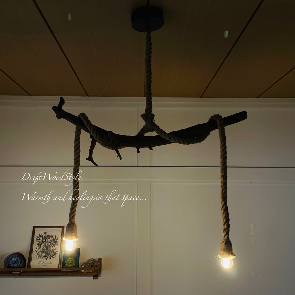 麻ロープの照明器具を流木に自由に絡ませて飾ることができます。