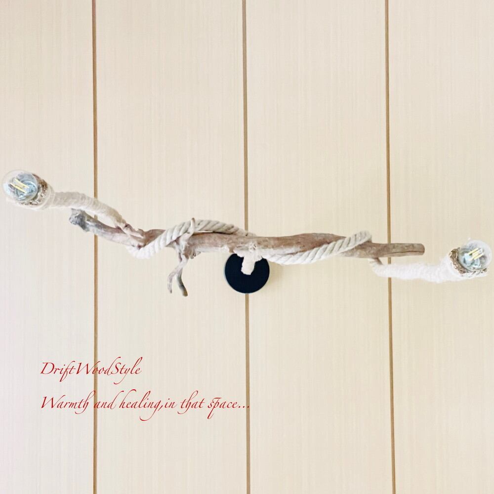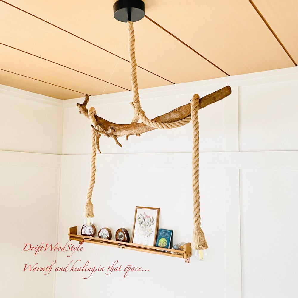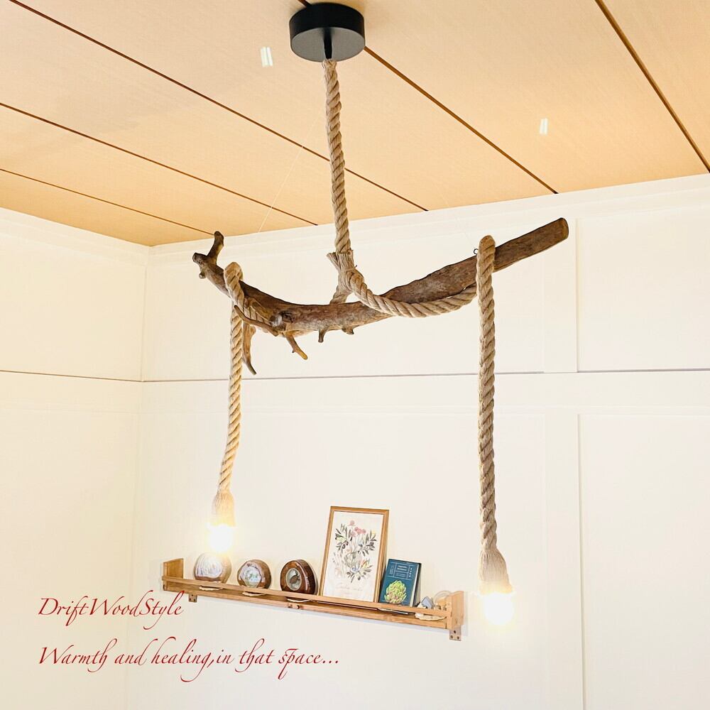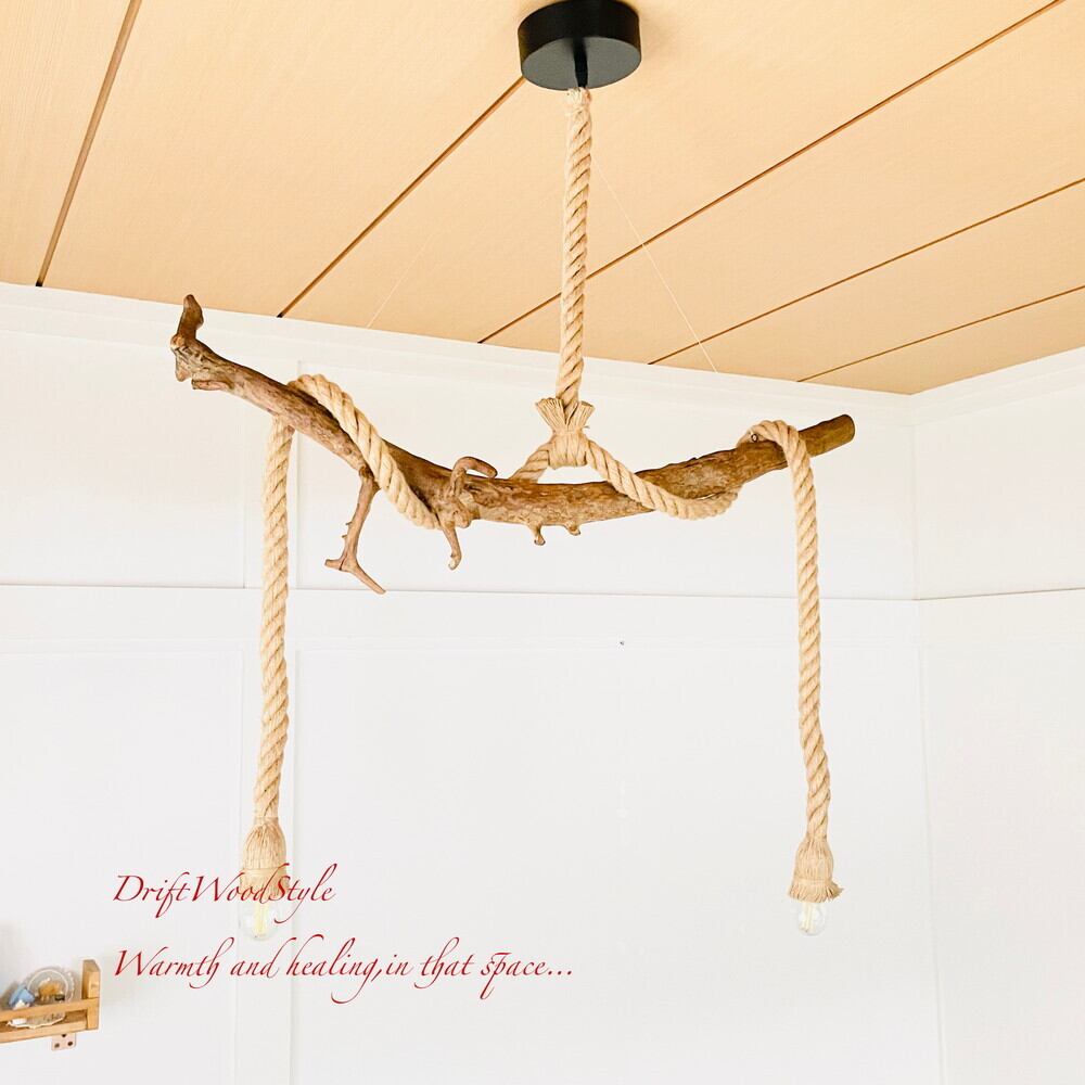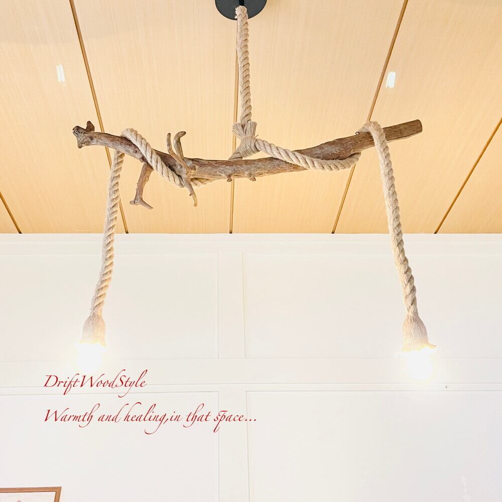 麻ロープの照明器具を流木に自由に絡ませて飾ることができます。