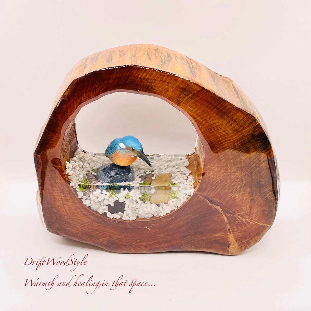 流木と自然界を結び付けて表現するために作成した,レジンアートです。