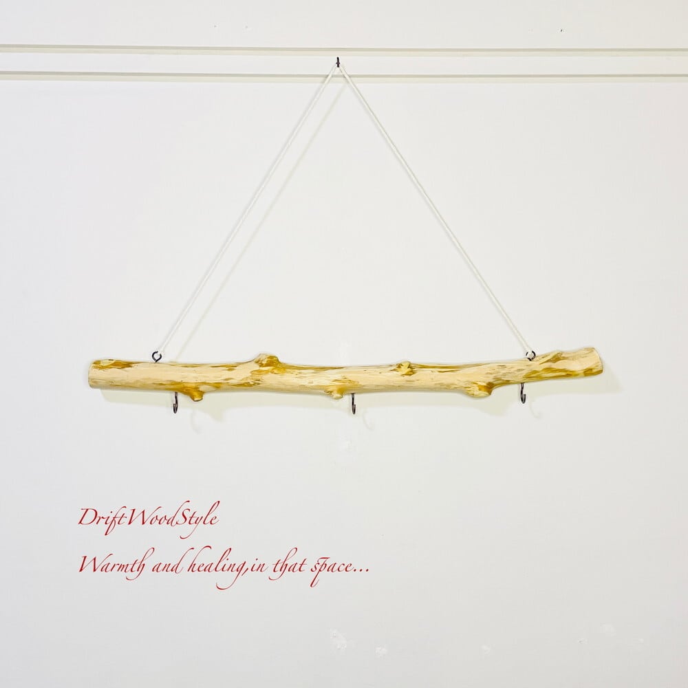 横幅が約60cmのサイズの流木で,フックを3個取り付けています。