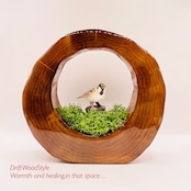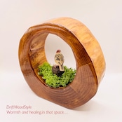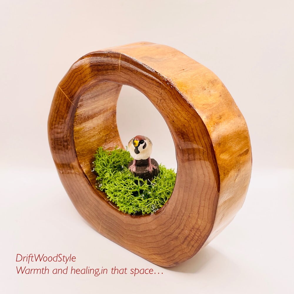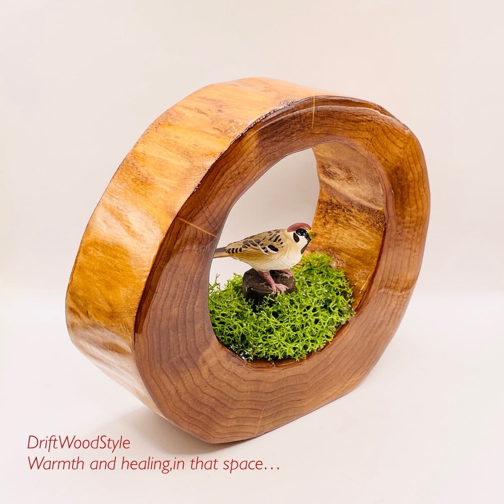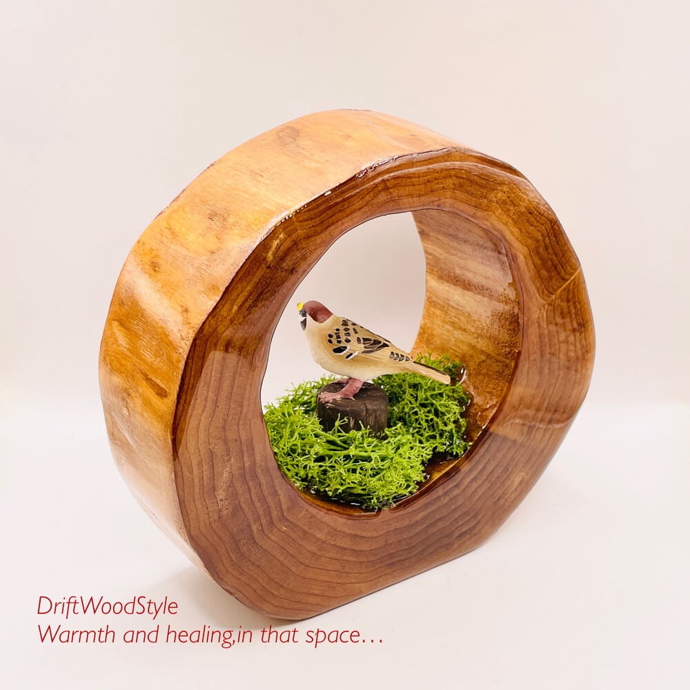 太い天然流木を切り抜き,そこに自然の世界を再現しました。