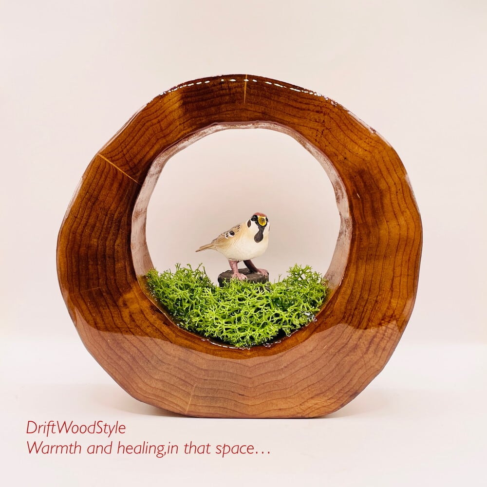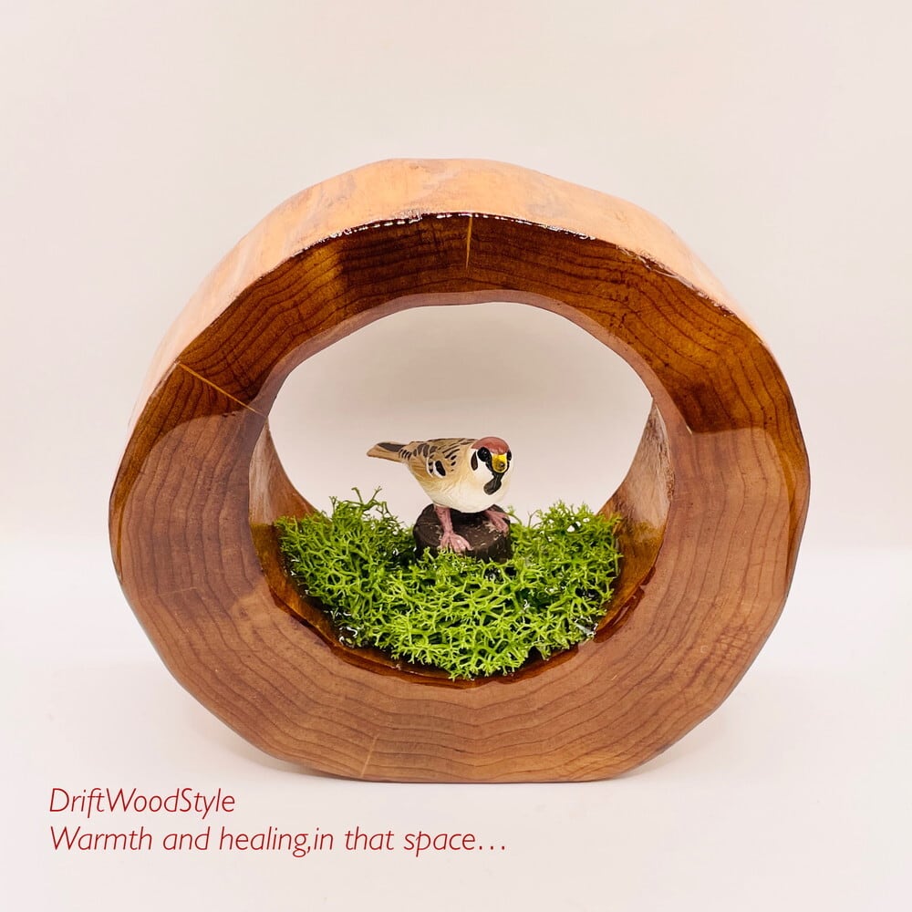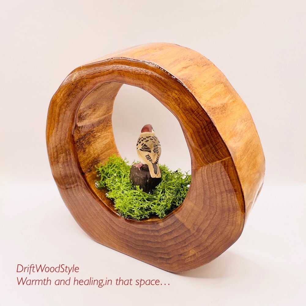 流木と自然界を結び付けて表現するために作成した,レジンアートです。