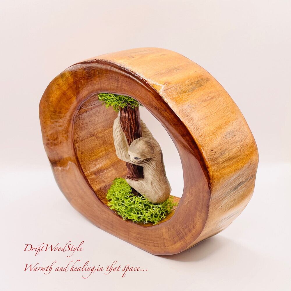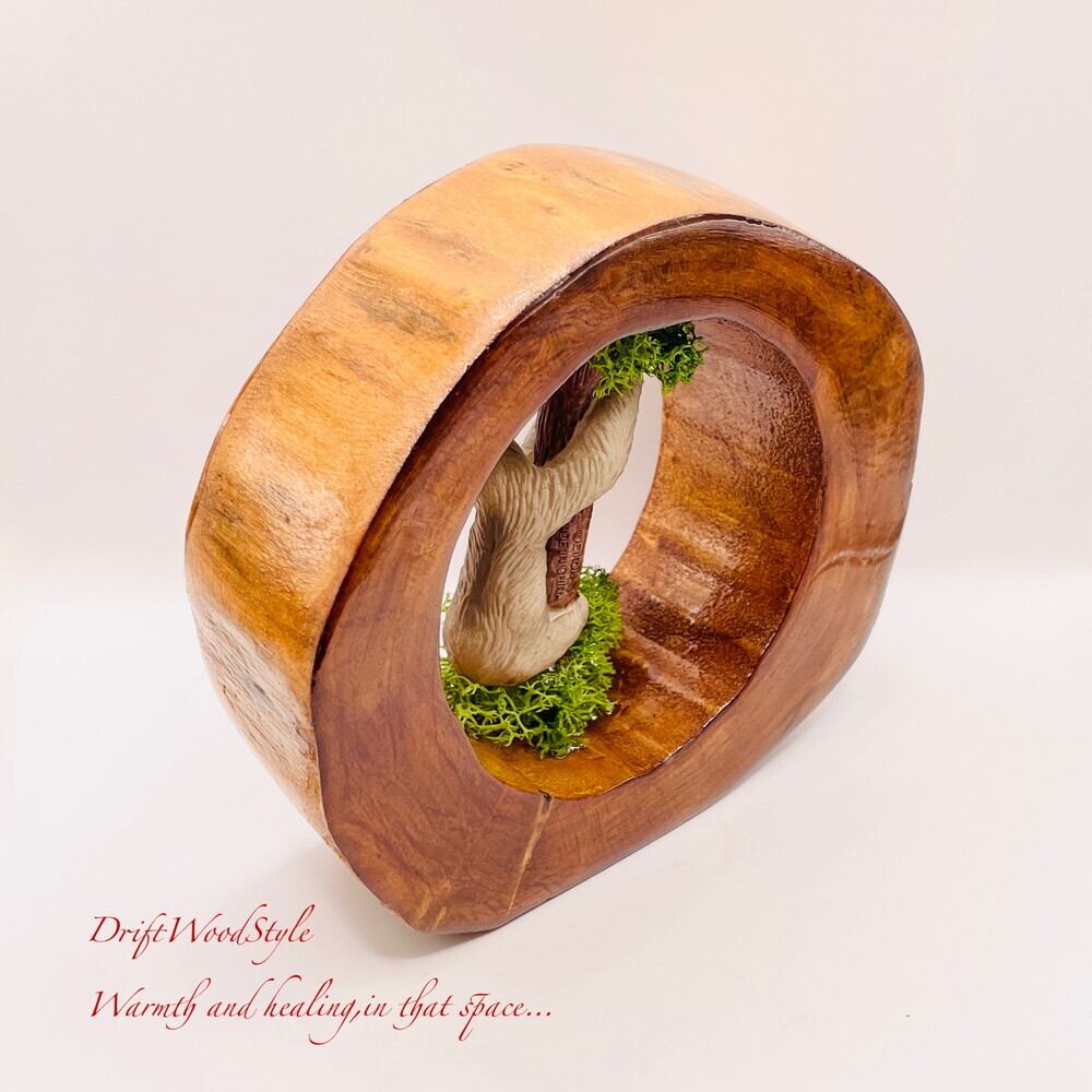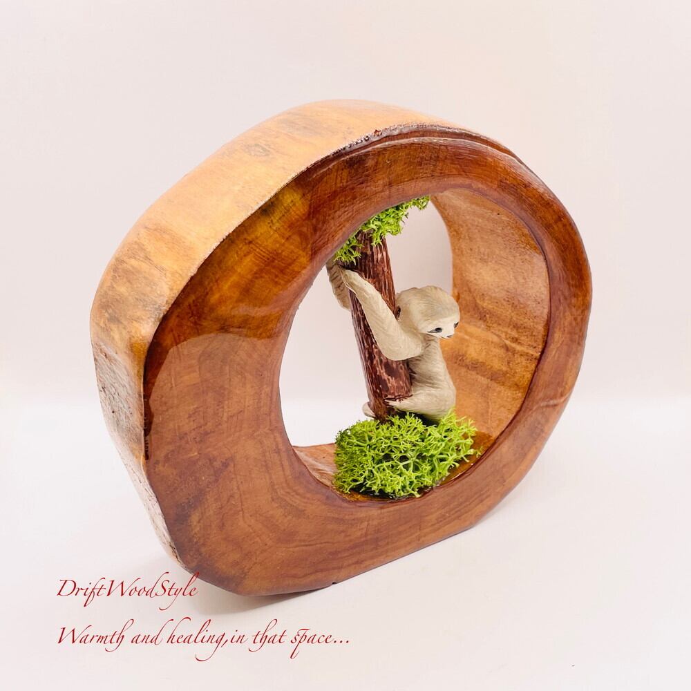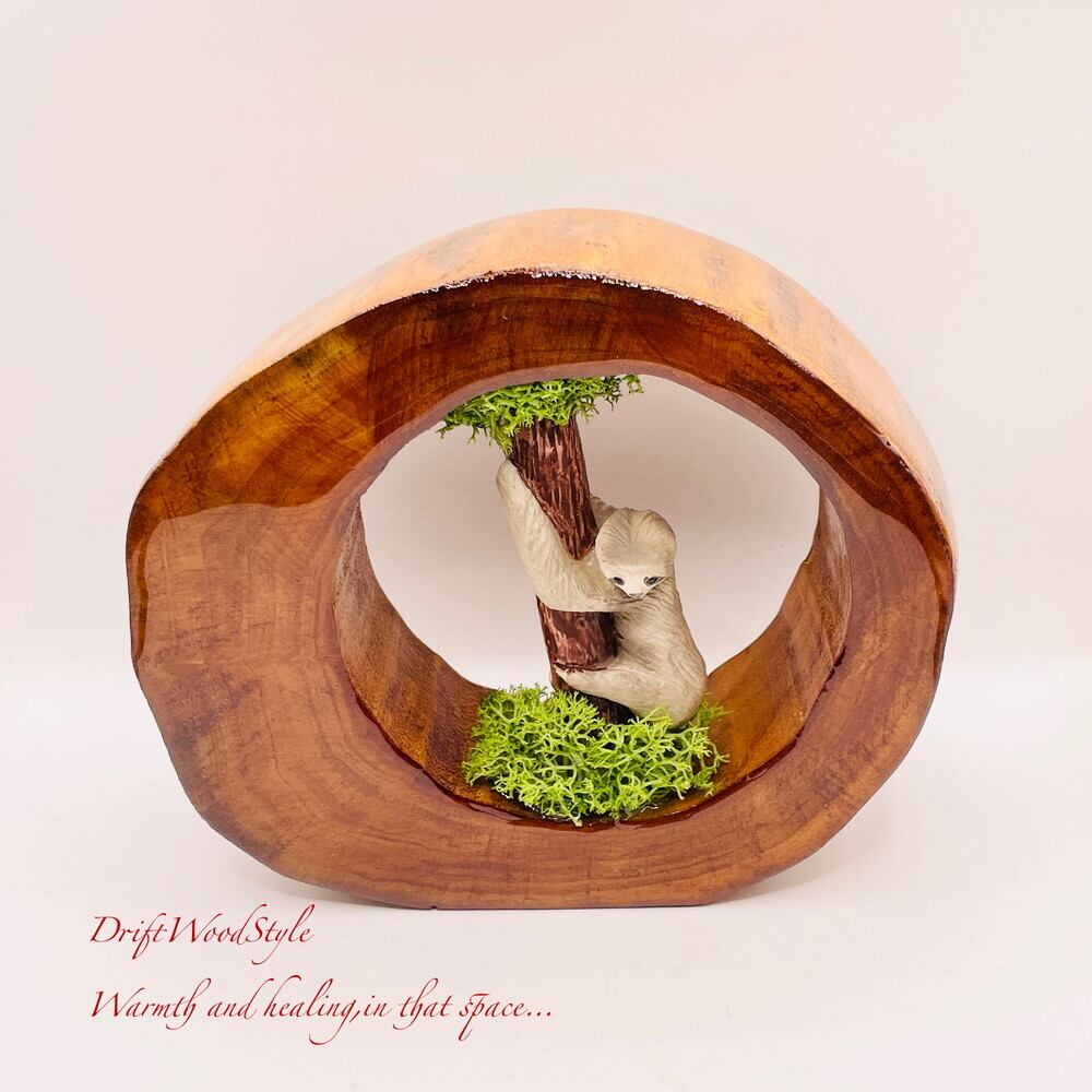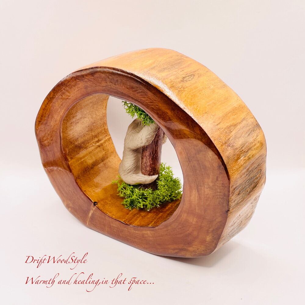 太い天然流木を切り抜き,そこに自然の世界を再現しました。