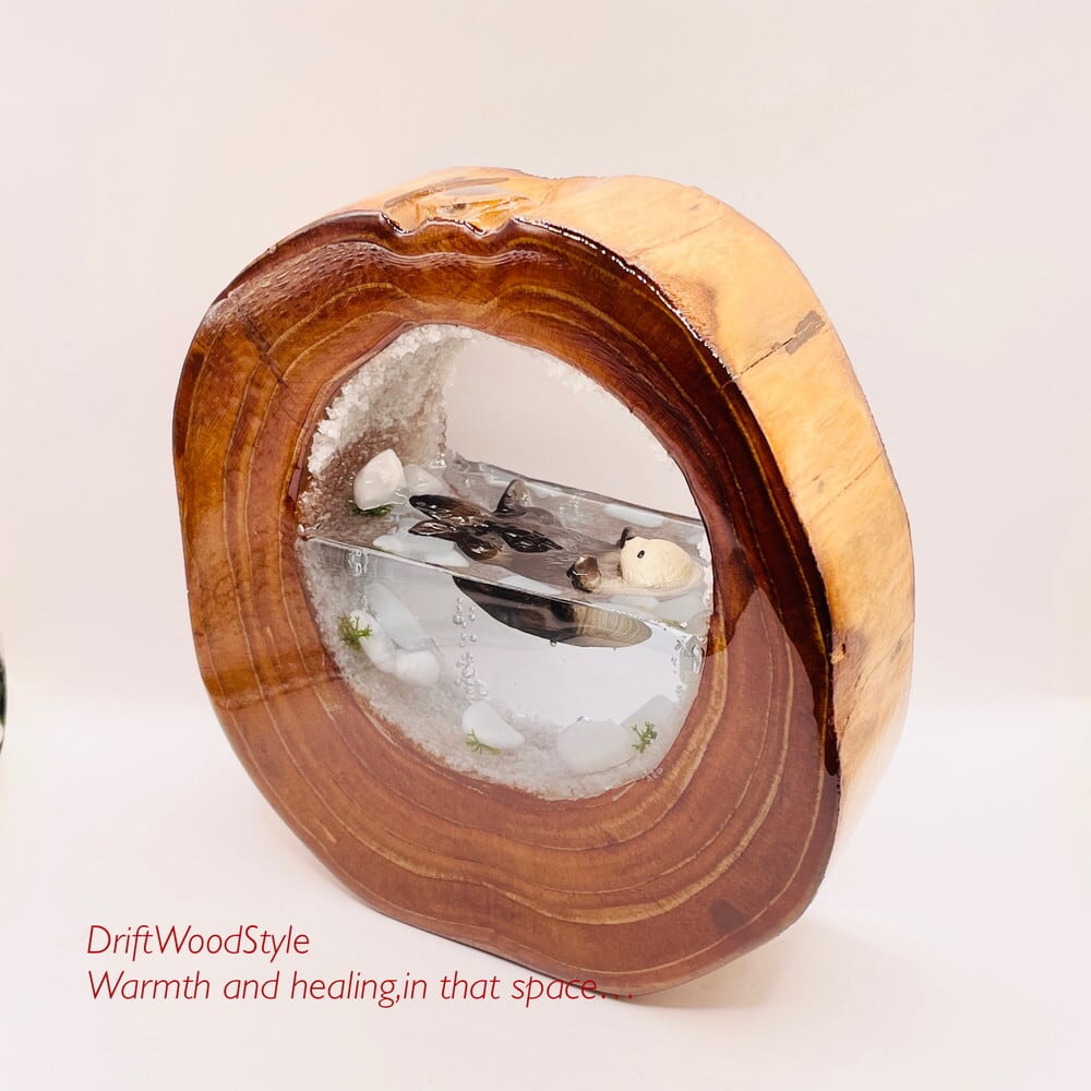 流木と自然界を結び付けて表現するために作成した,レジンアートです。