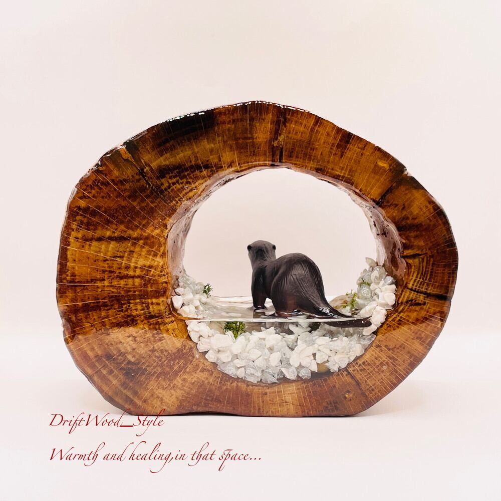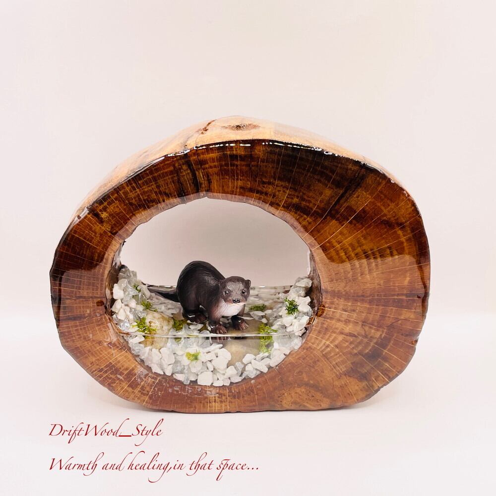 一つ限りの流木アート 川辺のコツメカワウソ ジオラマ 流木 フィギュア 置物 インテリア レジン カワウソ N6