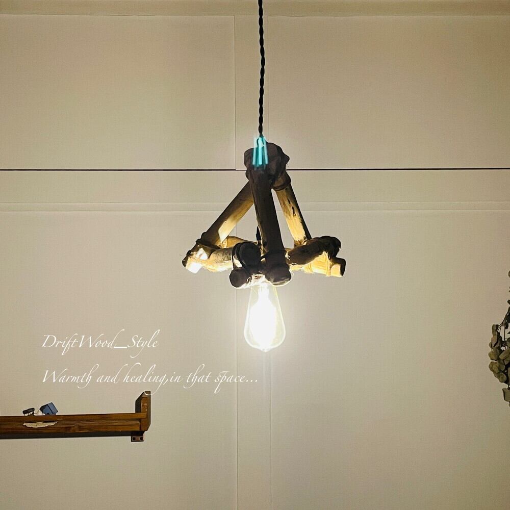 流木を麻ひもで組み合わせたシェードと,ペンダントライトのセットとなる作品です。
