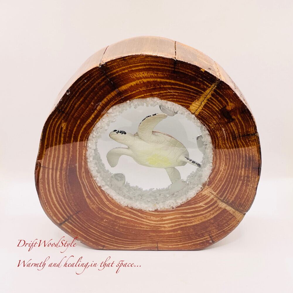 流木と海の世界を結び付けて表現するために作成したレジンアートです。